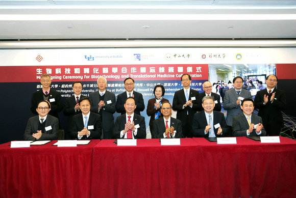 在香港特区政府创新及科技局局长杨伟雄先生、深圳市科技创新委员会书记、副主任邱宣女士、香港理工大学司库李国祥医生、香港理工大学校长唐伟章教授、中联办科技部副巡视员刘志明司长、纽约州立大学水牛城分校副校长Stephen Dunnett教授、深圳大学医学部主任朱卫国教授、澳门科技大学国际学院院长孙建荣教授和香港理工大学应用科学及纺织学院院长黄永德教授等见证下,我校副校长肖海鹏教授与香港理工大学副校长卫炳江教授、美国纽约州立大学水牛城分校校长Satish Tripathi教授、美国罗斯维尔帕克癌症研究所cGMP总监Yeong Christopher Choi教授、深圳大学校长李清泉教授、澳门科技大学健康科学学院院长霍文逊教授分别代表各院校/研究所签署了合作备忘录。