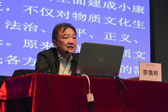 报告以“不忘初心,牢记使命,夺取新时代中国特色社会主义伟大胜利——学习中国共产党十九大精神的体会”为题。李慎明同志对党的十九大的重大意义、大会主题、报告框架结构及若干新理念、新论断、新任务、新举措进行了深入解读,他强调,要用辩证唯物主义和历史唯物主义世界观及方法论深刻认识十九大报告精神,把握好五大关系:中国特色社会主义进入新时代与马克思主义经典作家所说的时代的关系,关于我们党当今对我国社会主要矛盾与新中国成立后各个不同历史时期社会主要矛盾的不同判断的关系,习近平新时代中国特色社会主义思想与马列主义、毛泽东思想及中国特色社会主义理论体系的关系,关于中国特色社会主义与中国特色社会主义道路、理论体系、制度、文化之间的关系,站起来、富起来与强起来三个伟大飞跃之间的关系。同时,李慎明同志结合丰富详实的历史资料,进一步分析了学习贯彻十九大精神需要把握的国内外的七个机遇与七个挑战,鼓励大家不忘初心,牢记使命,坚定正确的理想信念,认真学习马克思主义理论,深入实际和群众,增强与人民群众的血肉联系,进一步增强忧患意识,认真关注、深入思考重大问题,夺取新时代中国特色社会主义伟大胜利。
