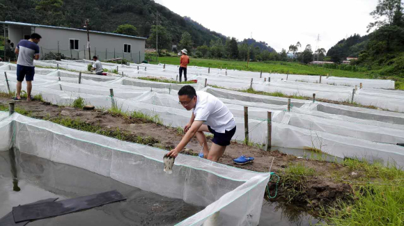 结合柯木湾村交通便利,运输成本低,水源清洁充足的特点,在校友企业荆州市民康生物科技有限公司技术支持下,学校在柯木湾村开展15亩水蛭养殖试点项目,组织贫困户成立专业合作社,通过村集体带动贫困户增收。水蛭养殖是新生事物,从工作队到村民,没人有相关经验,这就需要具体工作人员投入大量的时间精力,随时观察水蛭生长情况,随时处理问题,同时还要承担难以预测的风险。经过反复论证、思考,李晓超给自己制定了工作方针:敢闯敢干,精益求精。积极向校友企业派出的技术员请教,学习水蛭养殖基本知识,向学校随时反馈养殖进展和问题。并与村支部沟通协商,组成一线工作小组,让村委会的党员干部担任项目负责人,选派贫困户中的党员代表担任养殖员,高效解决实际问题,带动村党员在攻坚克难中发挥先锋模范作用。